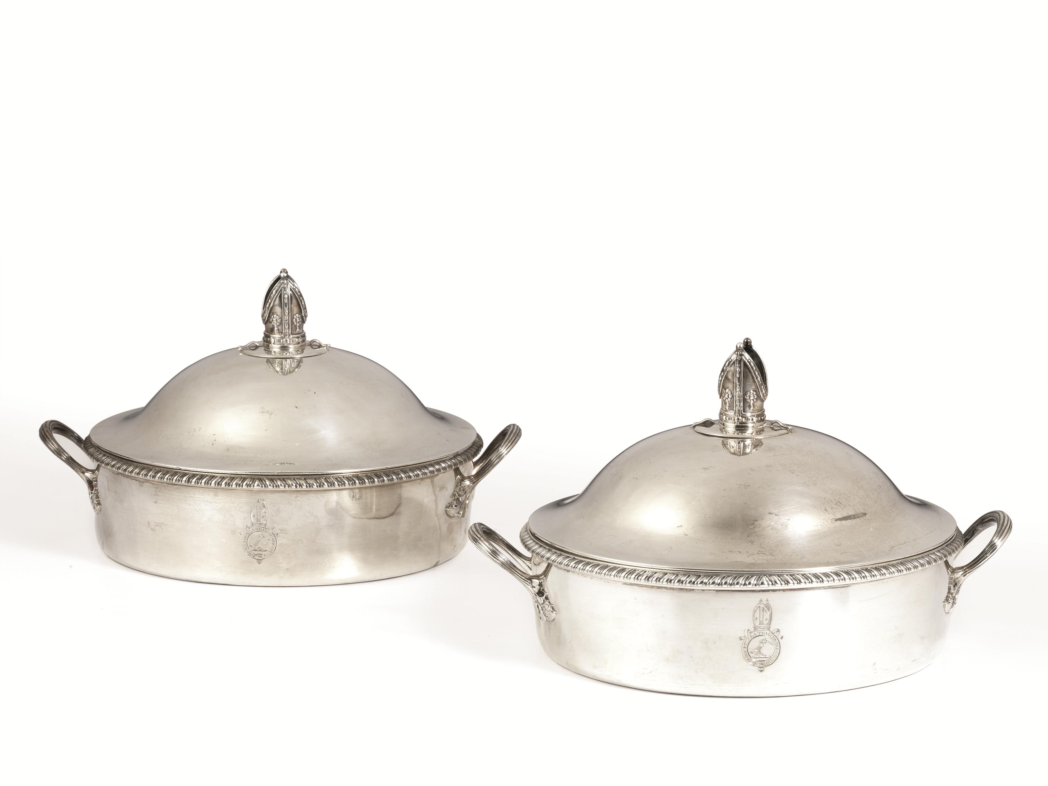 Coppia di legumiere, Londra 1804, di forma circolare, in argento, bordo a cordonetto, due anse unite al corpo da elementi fogliacei, coperchi con presa a mitria, g 2200 (2)