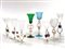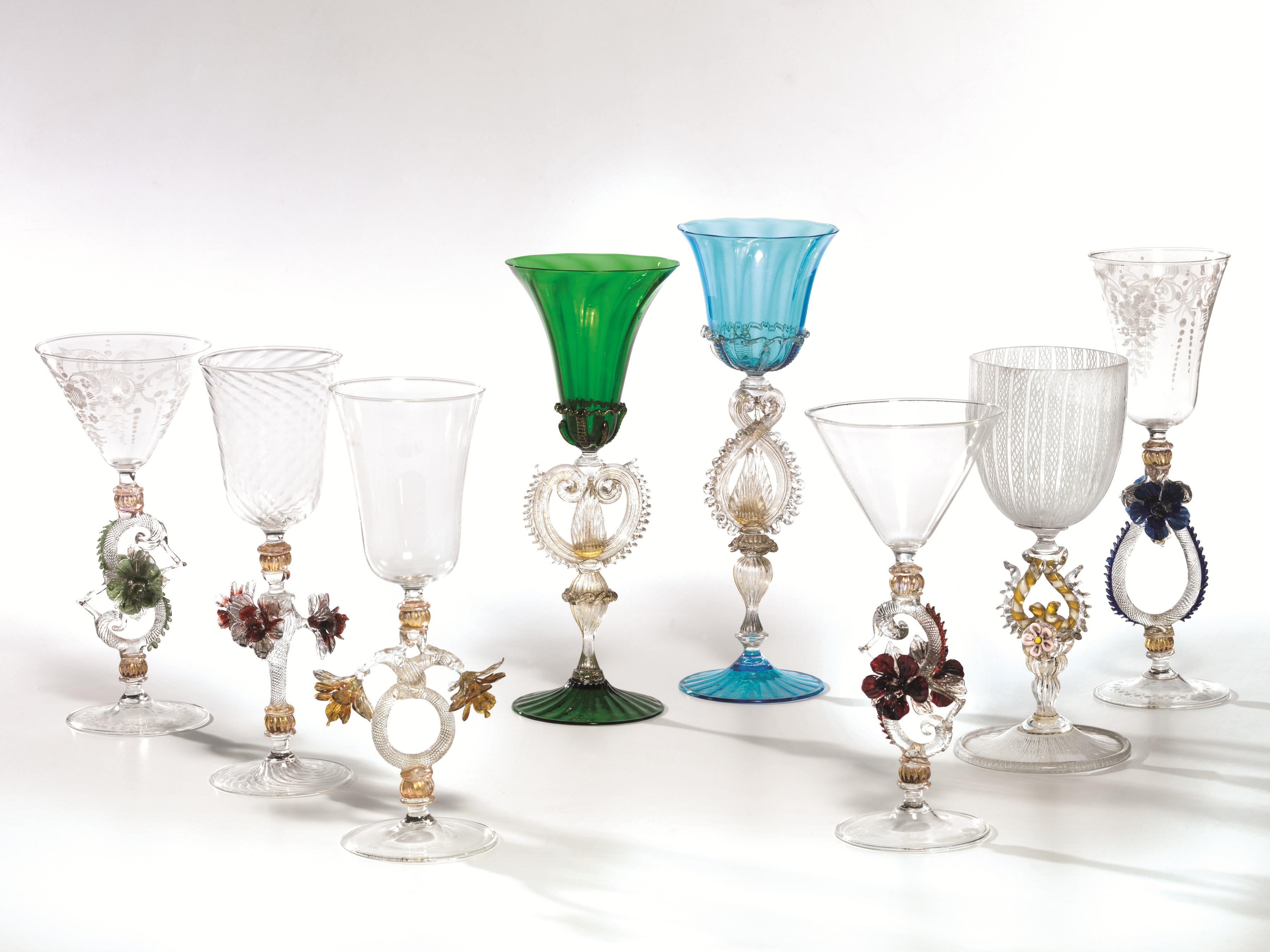 Otto calici, in vetro di Murano trasparente e colorato su alto piede con nodo lavorato a fiori e volute di modelli e misure diverse (8)