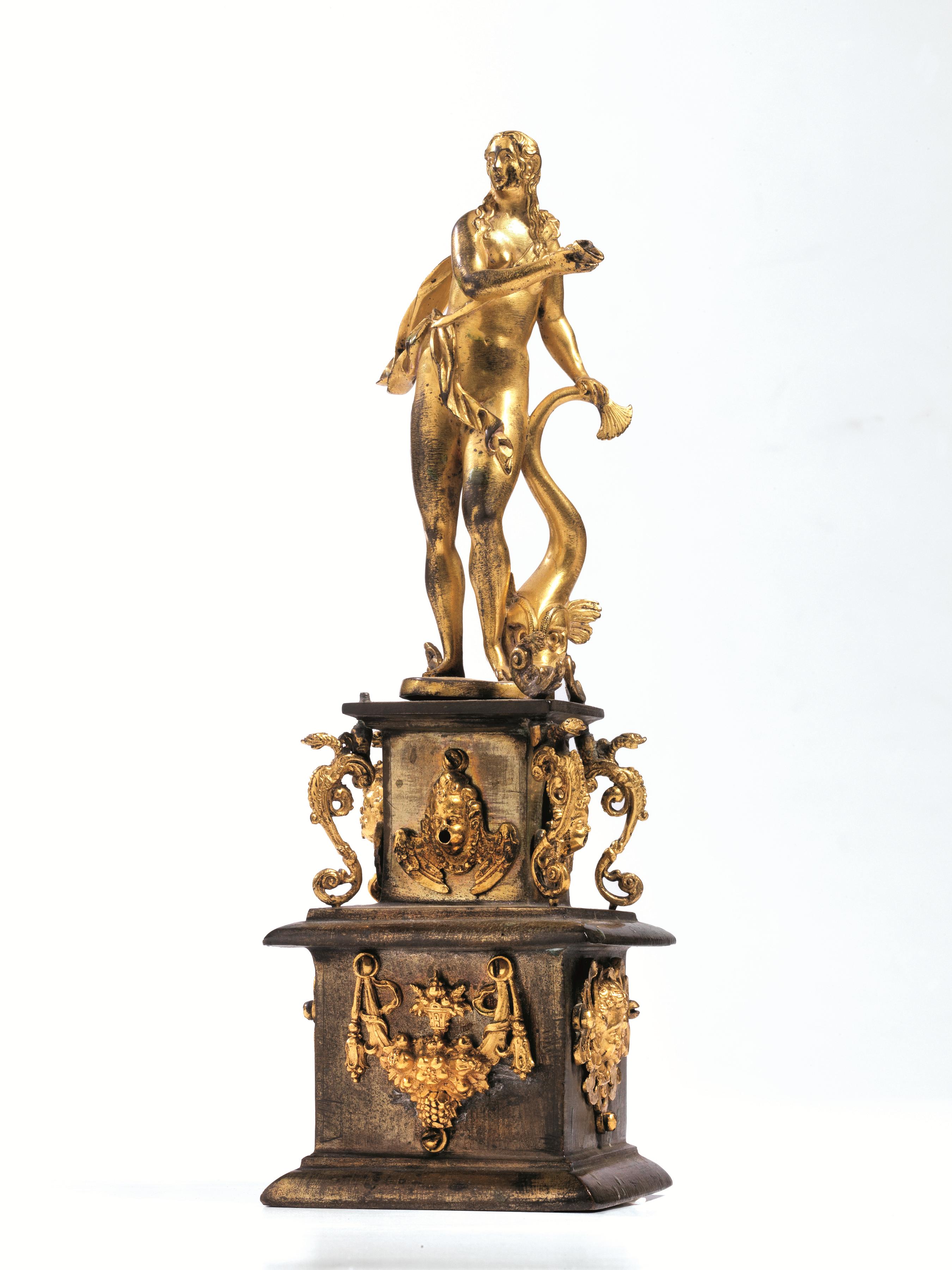 Scultura, sec. XVI, in bronzo modellato a figura di Venere stante, montata su alto plinto del sec. XVIII, con applicazioni a volute terminanti a teste di serpente, putti alati e festoni di fiori in bronzo dorato, alt. cm 28