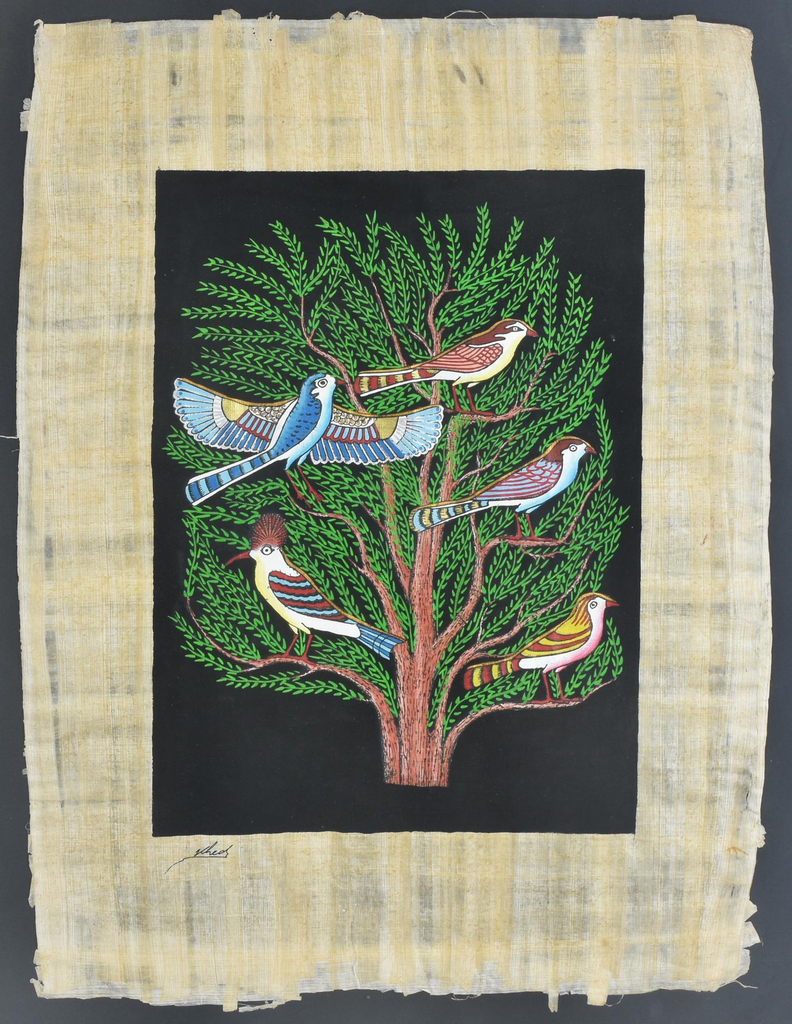 STAMPA EGIZIANA SU PAPIRO raffigurante albero con pennuti cm 48x36