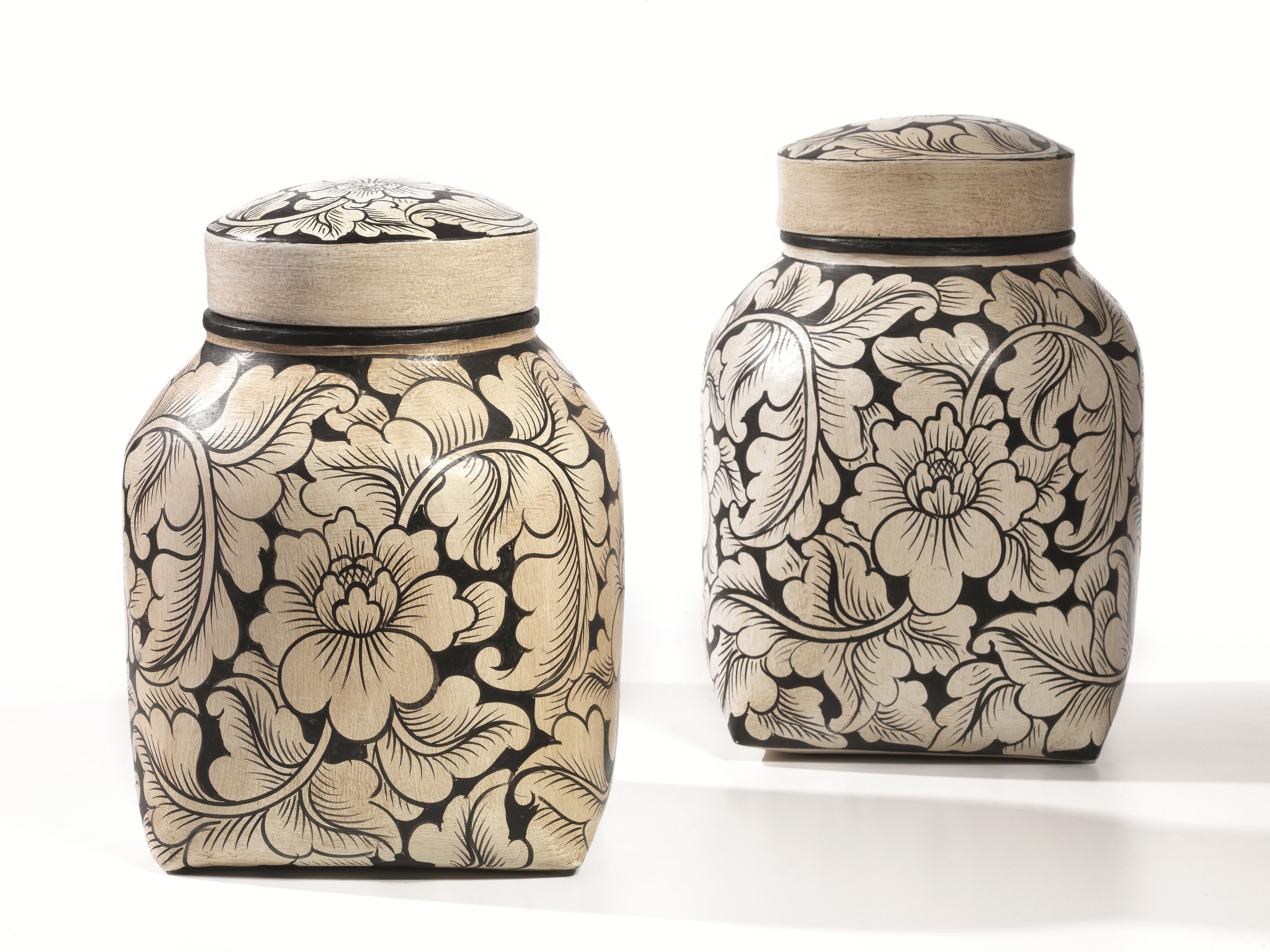 Coppia di vasi, sec. XX, papier maché, decorati a fiorami bianchi su fondo nero, alt. cm 33