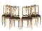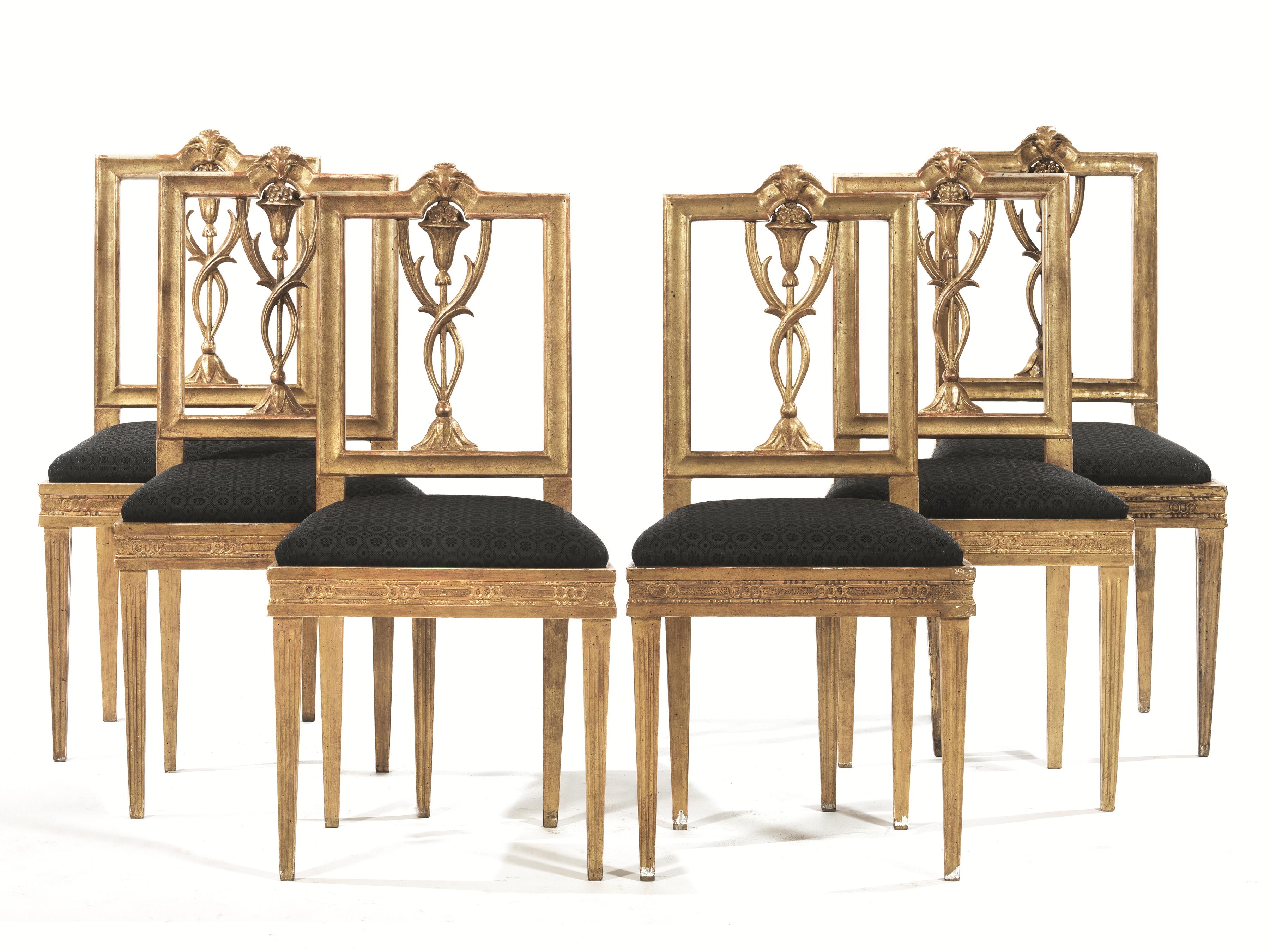 Dodici sedie in stile Settecento, in legno intagliato e dorato, spalliera rettangolare centrata da teste di ariete, cartella traforata a fiore di papiro, gambe troncopiramidali scannellate ricoperte in cotone operato blu, sei prive di cuscino (12)