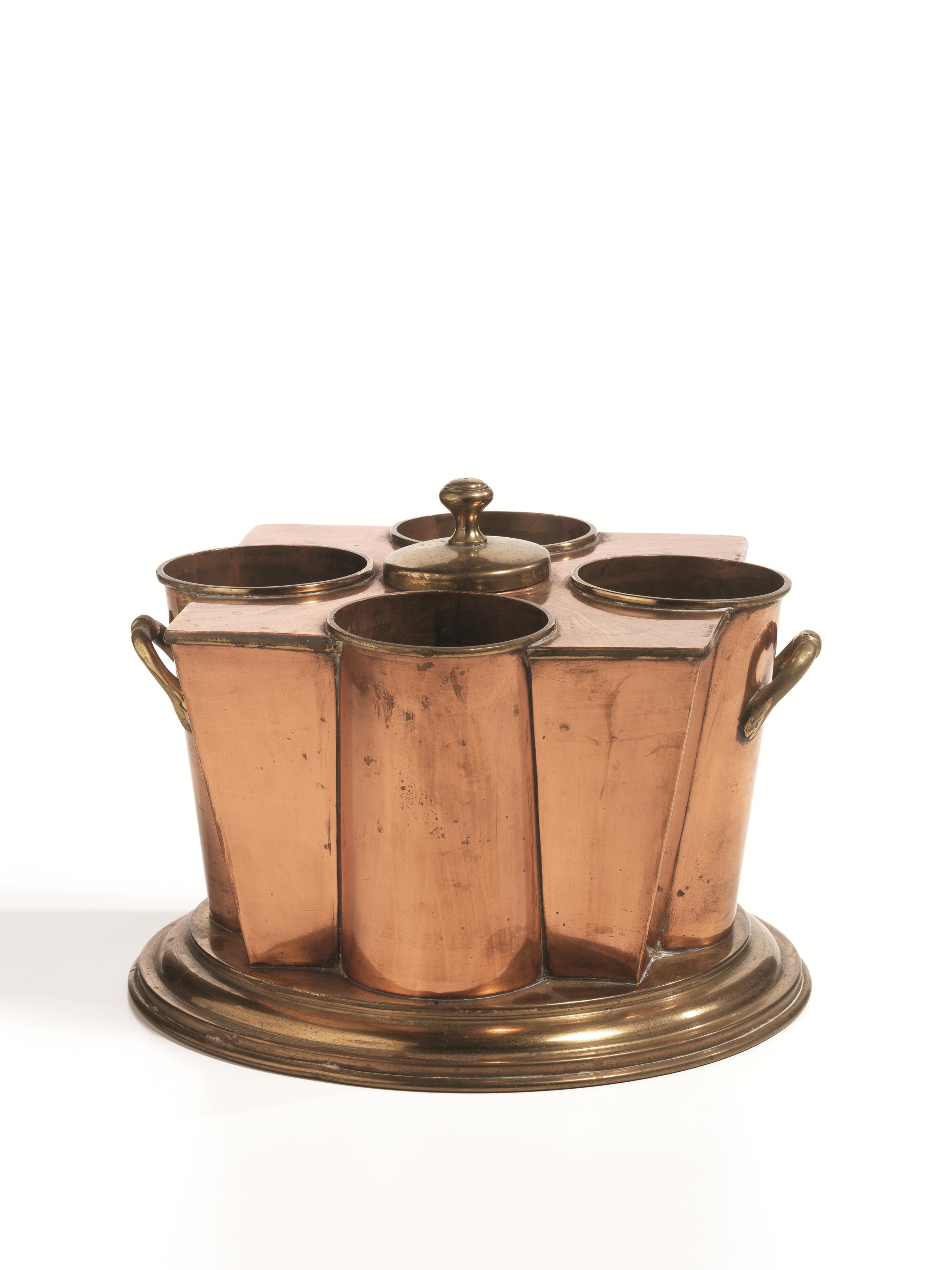 Portabottiglie, Londra, G. Peak&Co, in rame, su base circolare, fusto svasato da cui fuoriescono le quattro aperture circolari per contenere le bottiglie, ai lati due piccole maniglie, cm 24x31