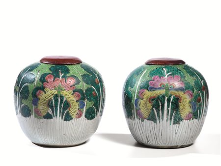 Coppia di potiches, Cina, inizi sec. XX, in porcellana decorata a motivi floreali, coperchi in legno, alt. cm 20 (2)