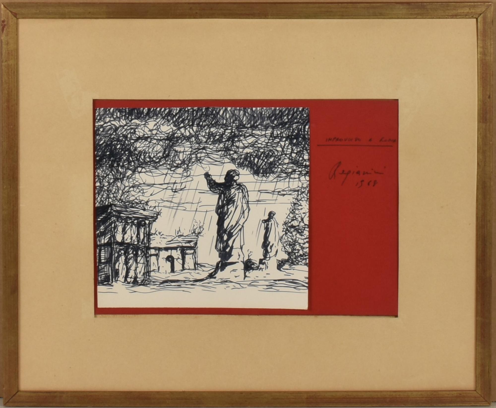 Luigi Regianini IMPROVVISO A ROMA disegno a china su carta, cm 19x20...