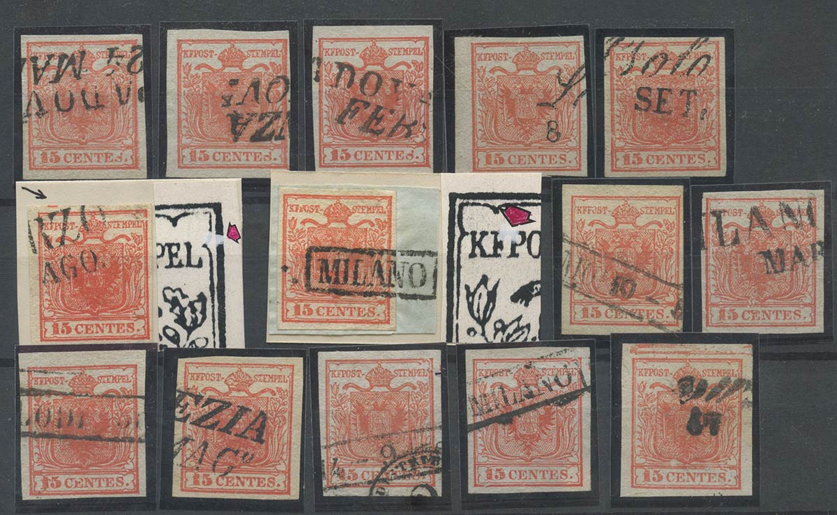 1850, 15c. I tipo N.3 piccolo studio dei difetti di clichè. Tutti di ottima qualità, diversi firmati. (A+/lux) (--)