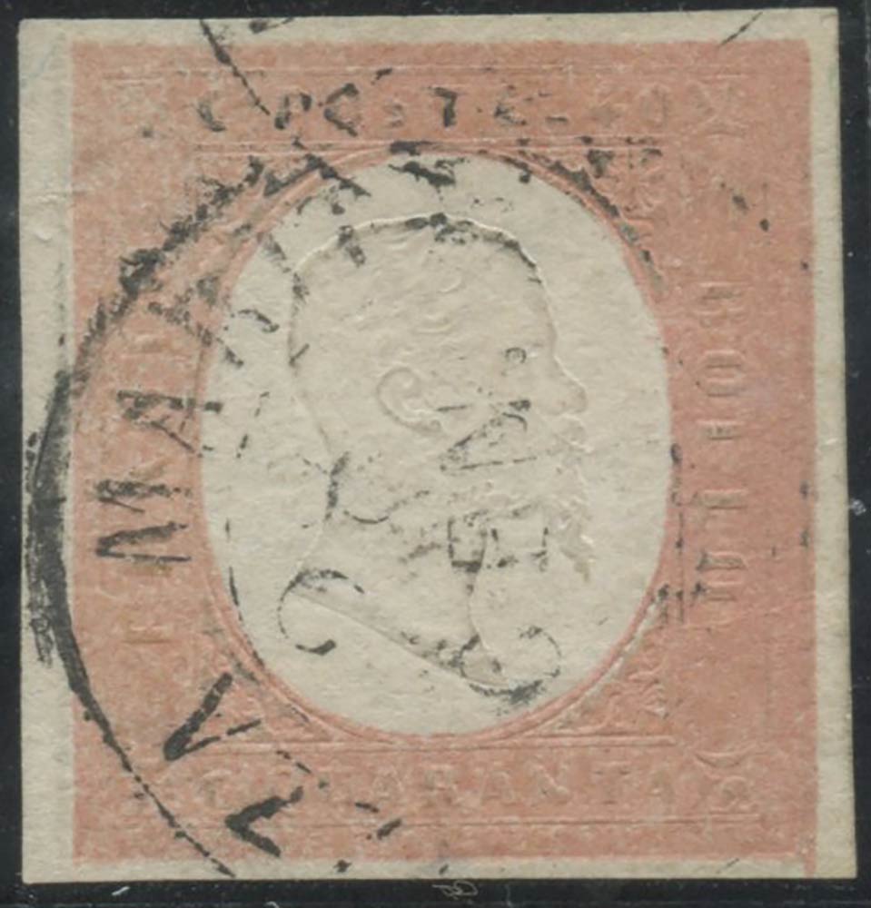 1854, 40c. Rosso Mattone Chiaro N.9b. Carta Sottile. Punto chiaro nel margine inferiore e sinistro. (A-) (Cat.6000++)