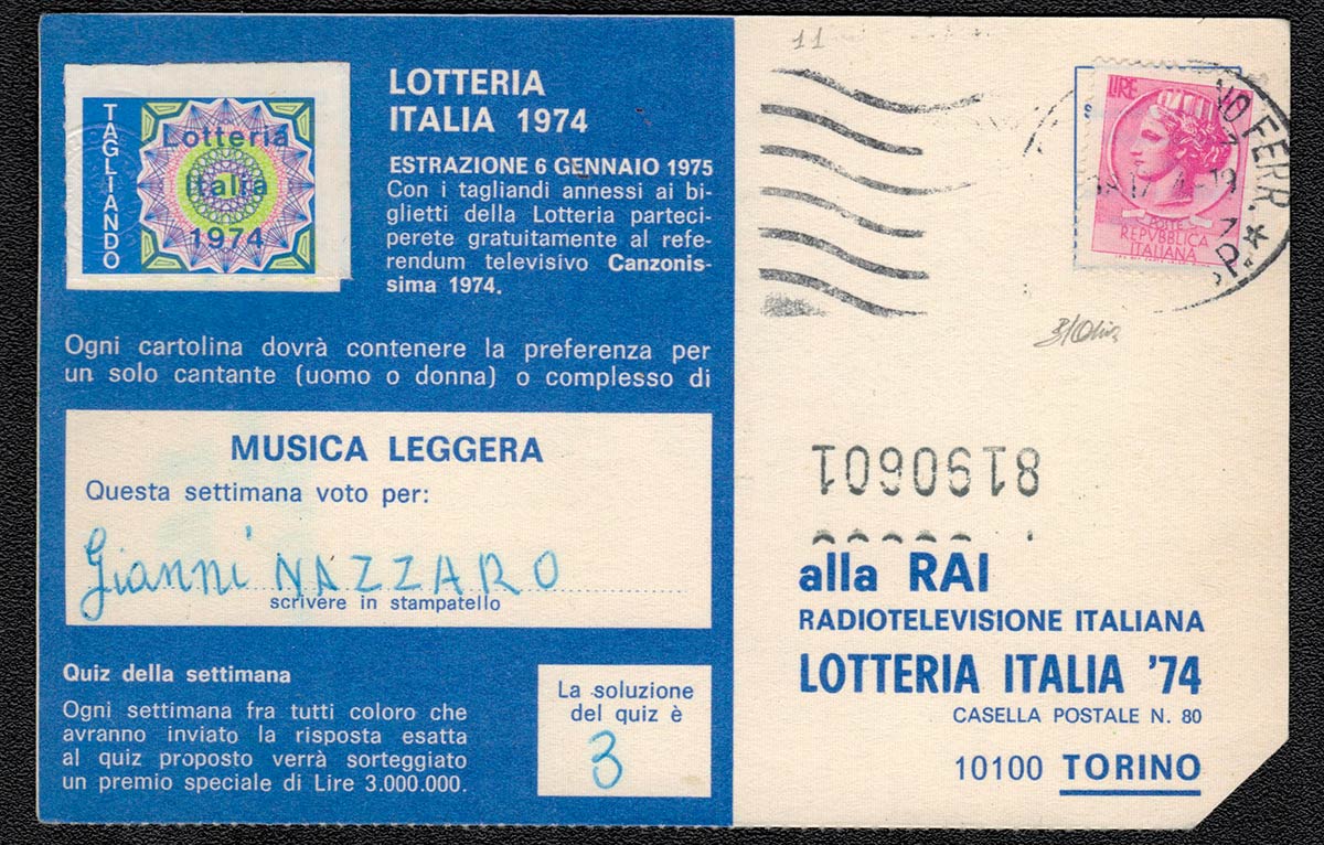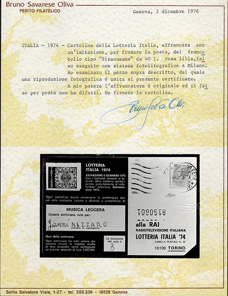 1974, Cartolina con il 40l. Siracusana falso di Milano. Cert.Oliva.