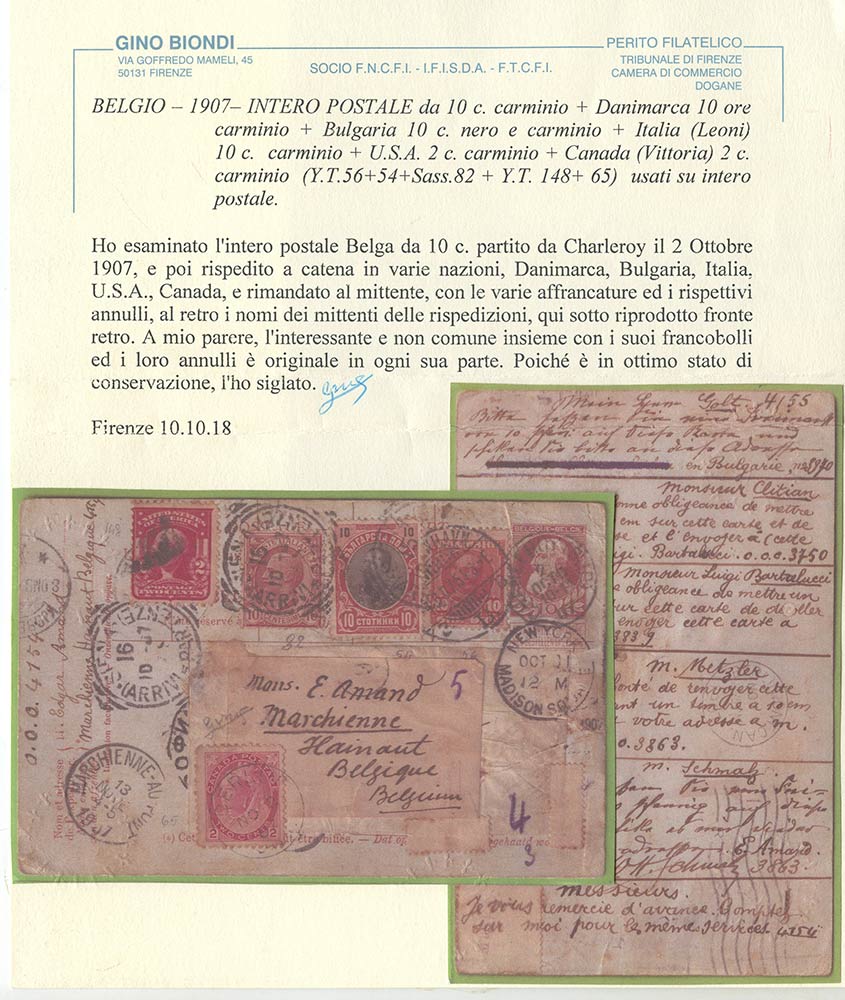 Intero Postale partito da Charleroy il 2.10.1907 e poi rispedito a catena in varie nazioni: Danimarca, Bulgaria, Italia, U.S.A.. Canada e rimandato al mittente. Cert. Biondi.
