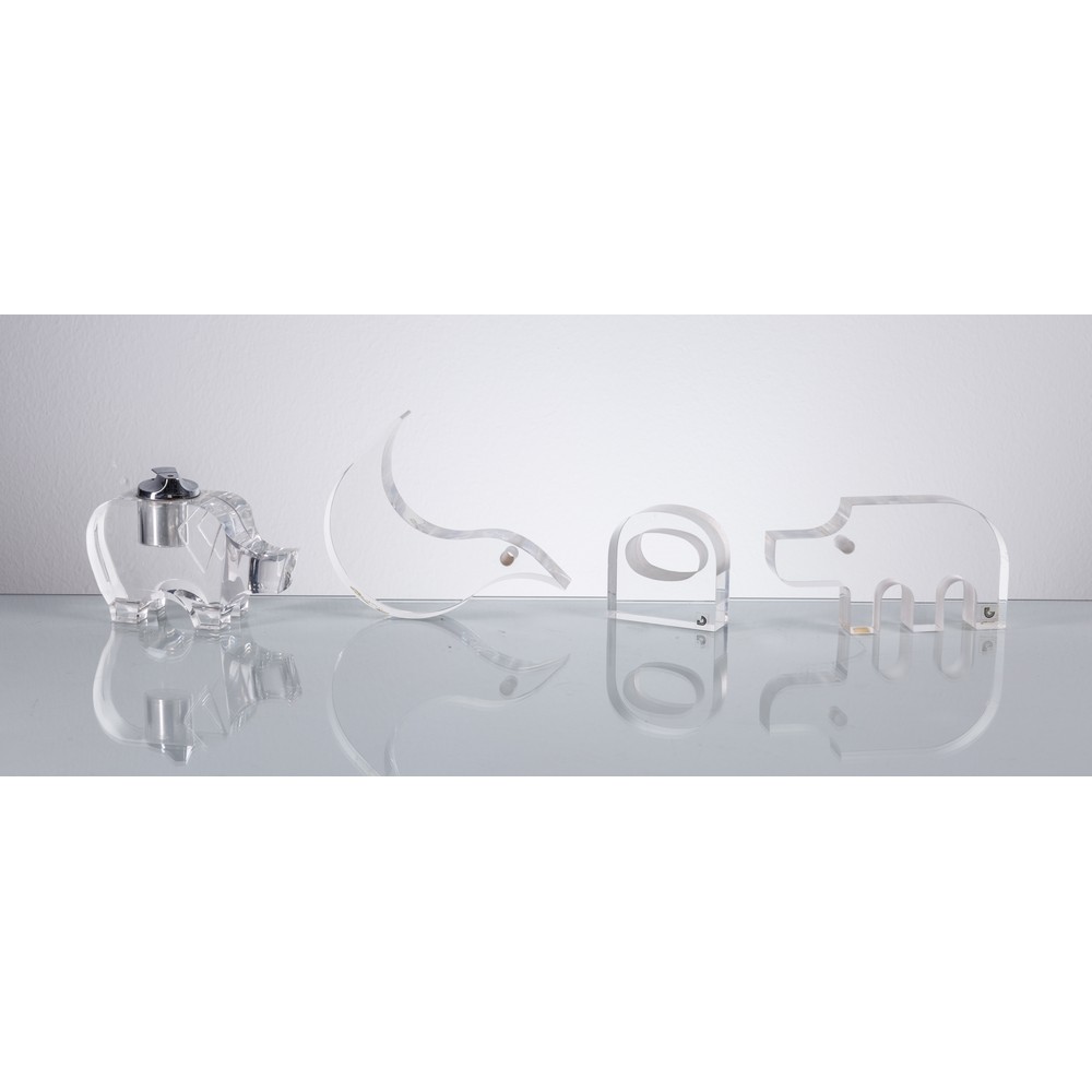 Quattro sculture in plexiglass di forte spessore firmate Team Guzzini, raffiguranti un maialino con un accendino inserito sul dorso, un rinoceronte, un uccello e uno astratto.