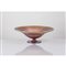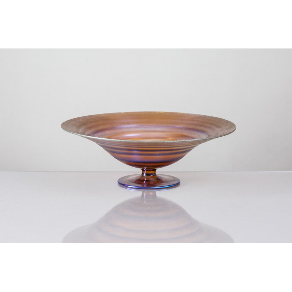 Centrotavola in vetro, corpo circolare, piede con basso collo, bordo piano, nei toni ambra e blu.