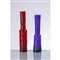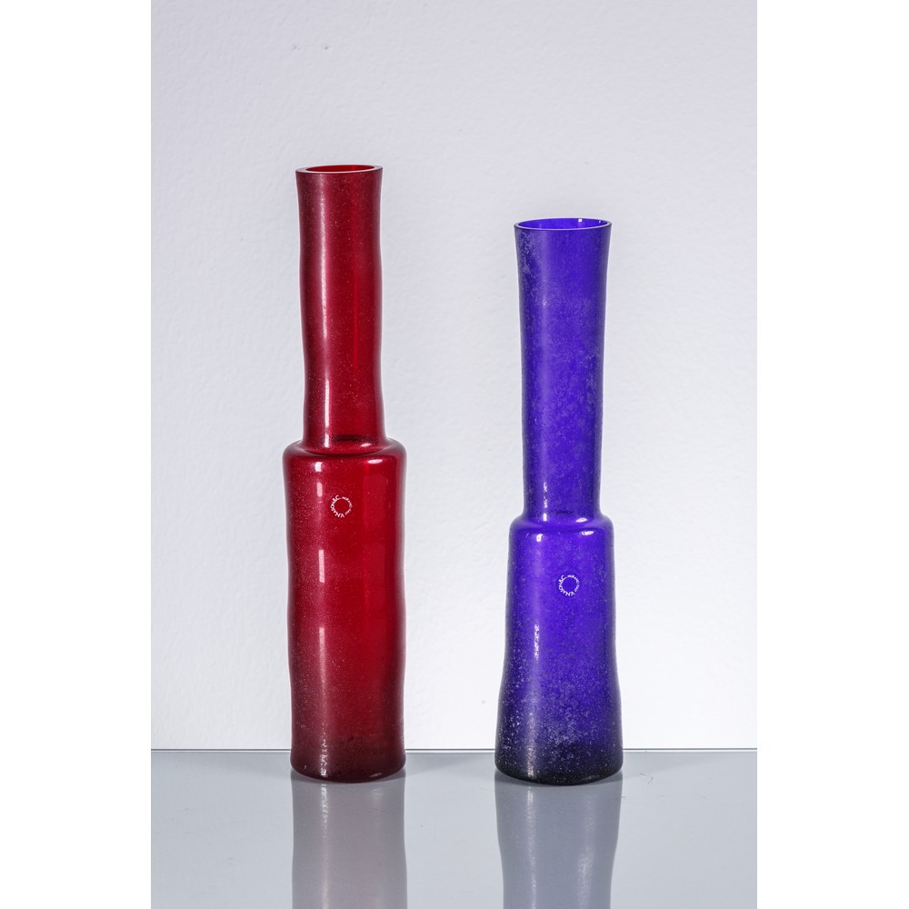 Coppia di vasi solifleur, corpo cilindrico, lungo collo, bocca piana, vetro acidato rosso, incamiciato e blu. Etichetta Carlo Nason.