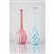 Due bottiglie in vetro lavorato con filigrane a canne colorate rosse e azzurro, corpo ovale con lungo collo, bordo estroflesso.