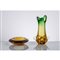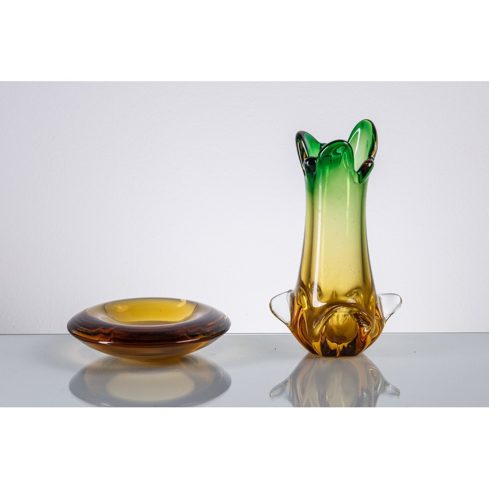 Un vaso in vetro sommerso, corpo informale con decori a rilievo nella parte inferiore, bocca trilobata con angoli arrotondati, nei toni ambra e verde. Una ciotola in vetro sommerso nei toni ambra, corpo circolare con interno concavo. Uno firmato all’acido.