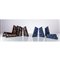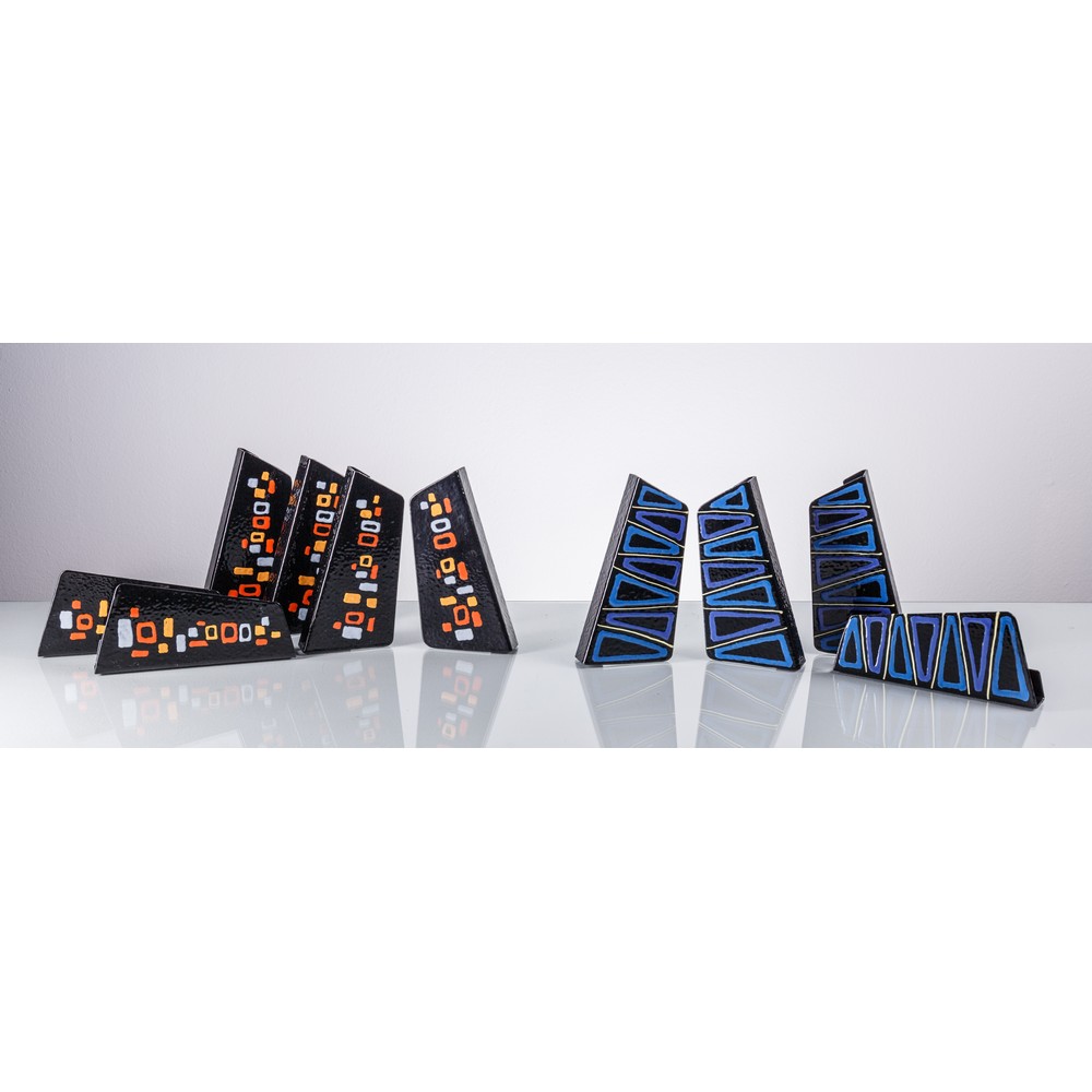Dieci maniglie in metallo smaltato nero sei con decori geometrici arancione e gialli, quattro con decori geometrici blu.