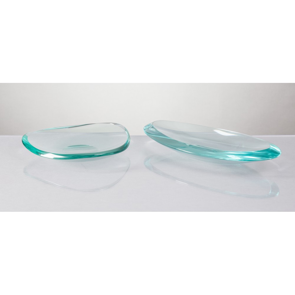 Due svuota tasche in vetro di forte spessore curvato e molato, uno con corpo ellittico, l’altro triangolare.