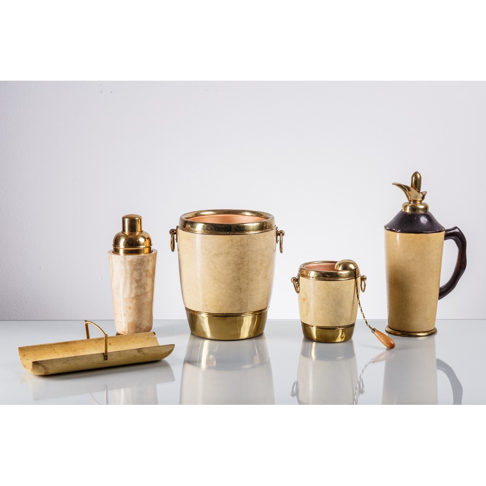 Cinque complementi da barman, due suaglass (uno porta ciliegie con mestolo), uno shacker, un thermos, un porta tovaglioli, in legno, pergamena, rame e ottone, due con timbro.
