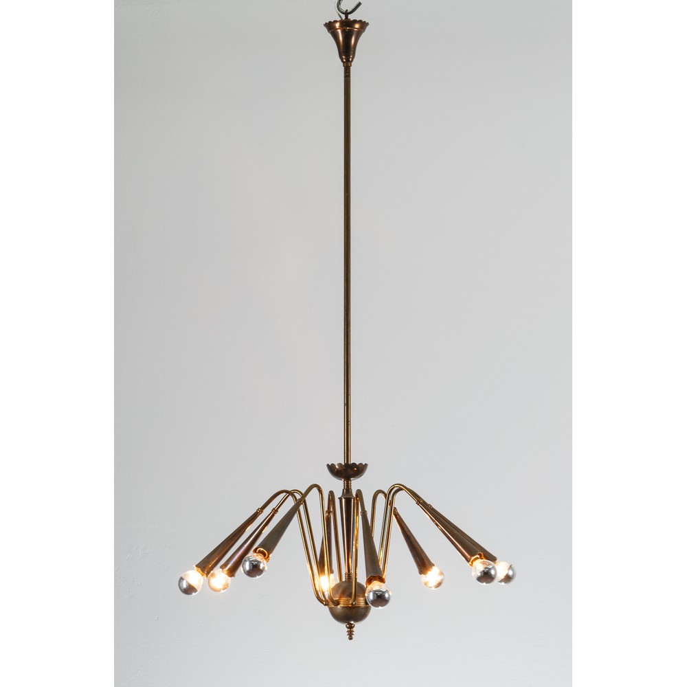Lampada a sospensione a otto luci, corpo a ragno, struttura in ottone ad otto bracci.