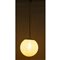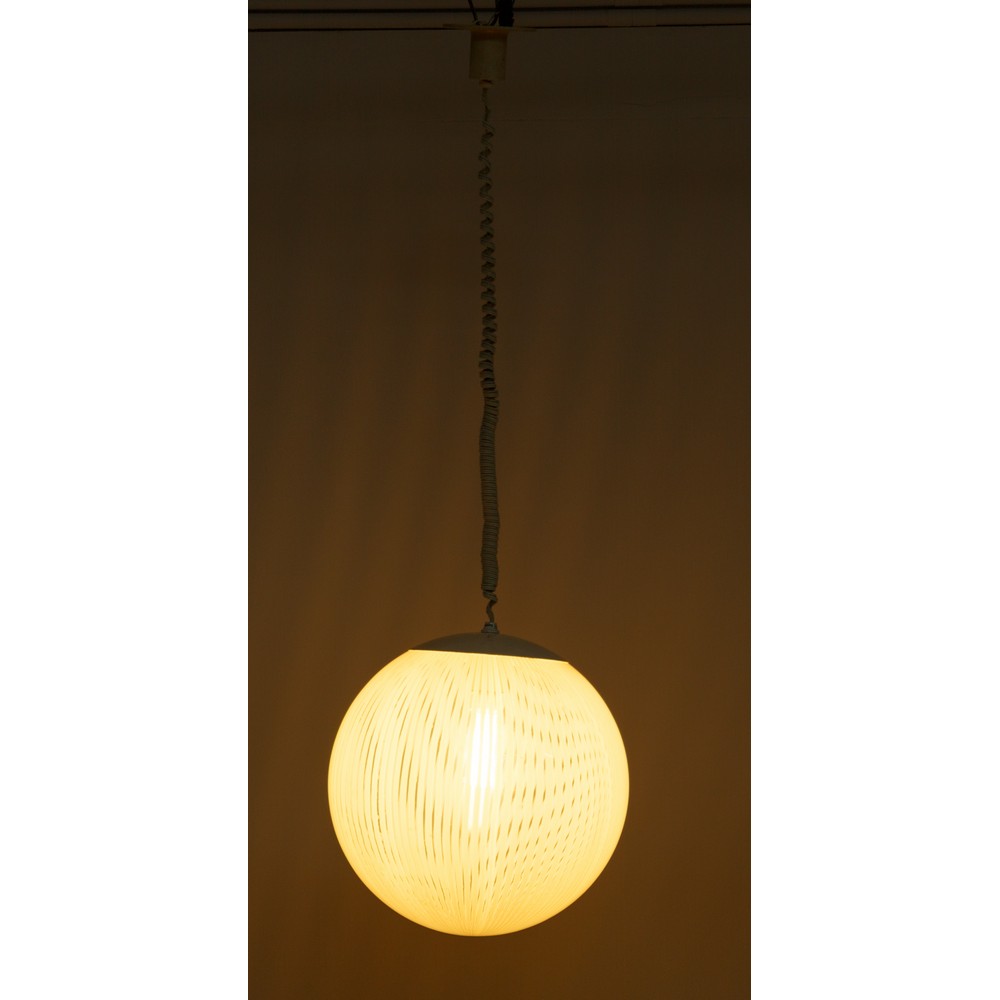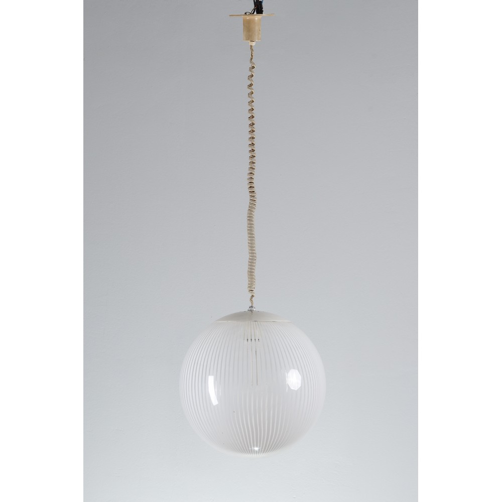 Lampada a sospensione della serie ‘Tessuti’, diffusore luminoso a corpo sferico in vetro soffiato a canne lattimo e cristallo, attacco in acciaio laccato bianco.