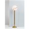 Lampada da terra ad una luce, struttura in ottone, diffusore sferico in vetro lattimo decorato con larga murrina a righe nera.