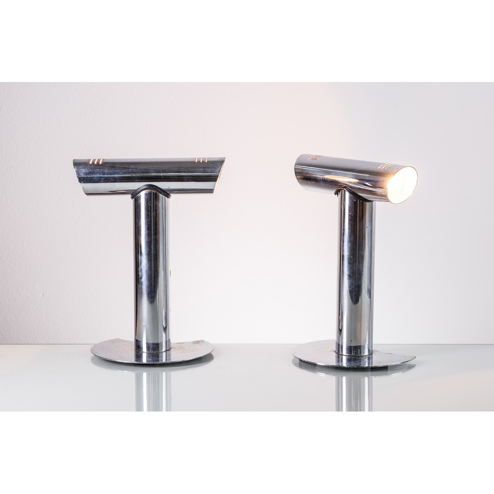 Coppia di lampade da tavolo a due luci, in metallo cromato, corpo tubolare a ‘T’, diffusore tubolare.