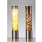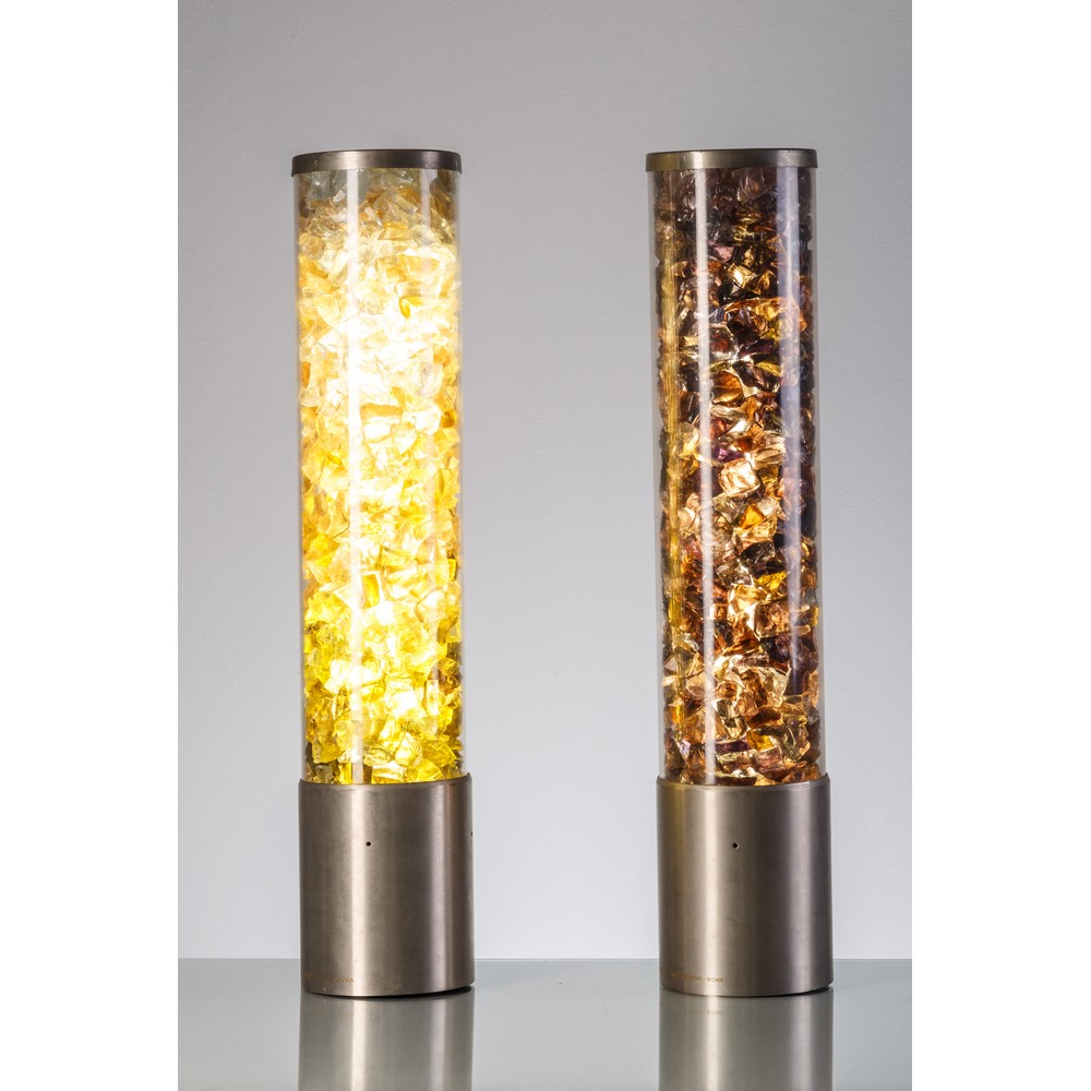 Coppia di lampade da tavolo ad una luce, corpo cilindrico, base in acciaio satinato, diffusore perspex e vetri colorati. Marchio alla base.