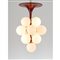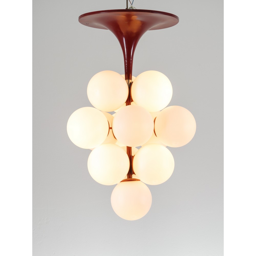Lampada a sospensione ‘Space Age‘ struttura in metallo laccato rosso, quattordici diffusori a grappolo a globi in vetro opaco bianco.