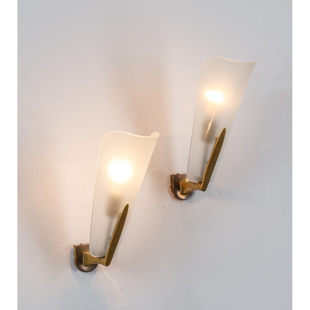 Coppia di lampade da parete ad una luce, struttura in ottone con diffusore curvato in vetro satinato.