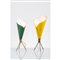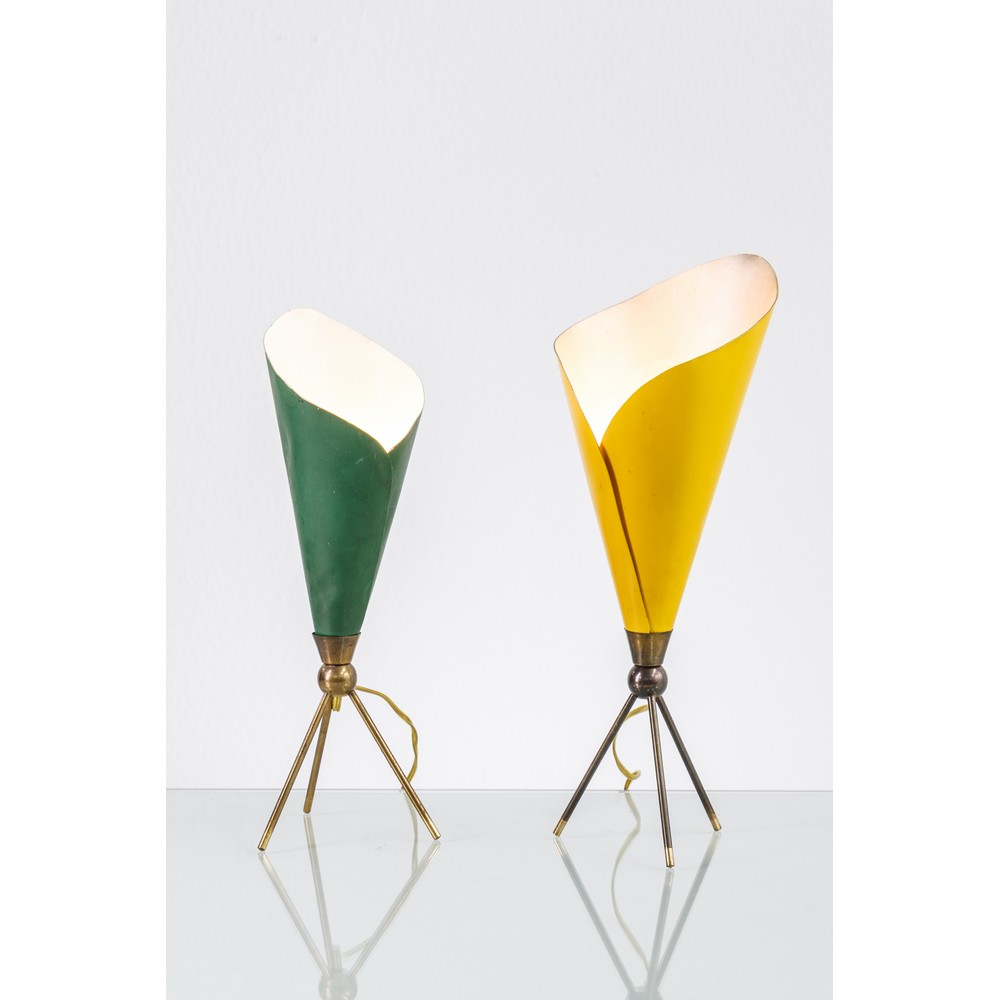 Due lampade da tavolo ad una luce, struttura in ottone con piede tripode, diffusore conico in alluminio laccato giallo e verde.