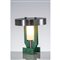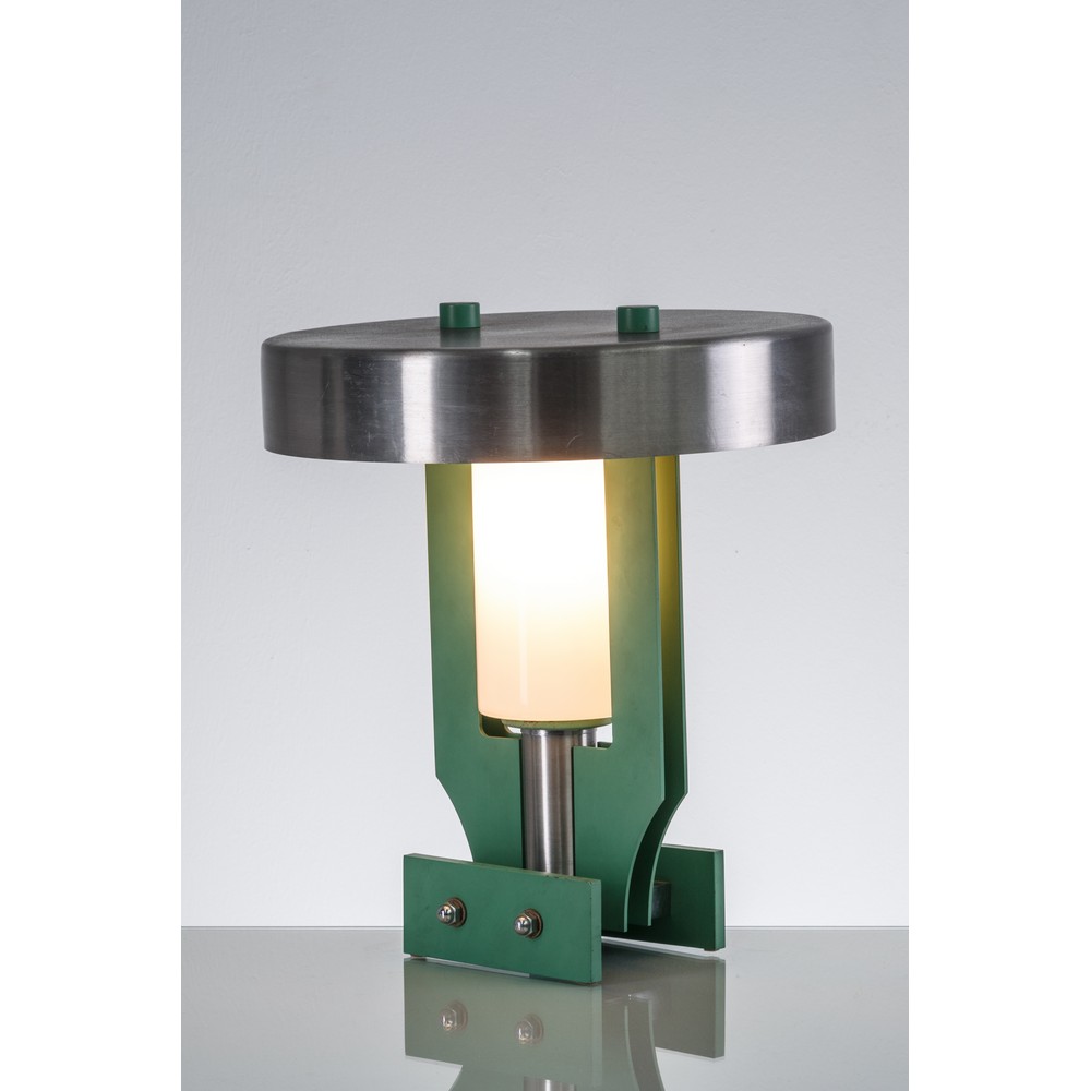 Lampada da tavolo ad una luce, corpo geometrico in metallo verde, diffusore cilindrico in vetro bianco, cappello circolare in alluminio.