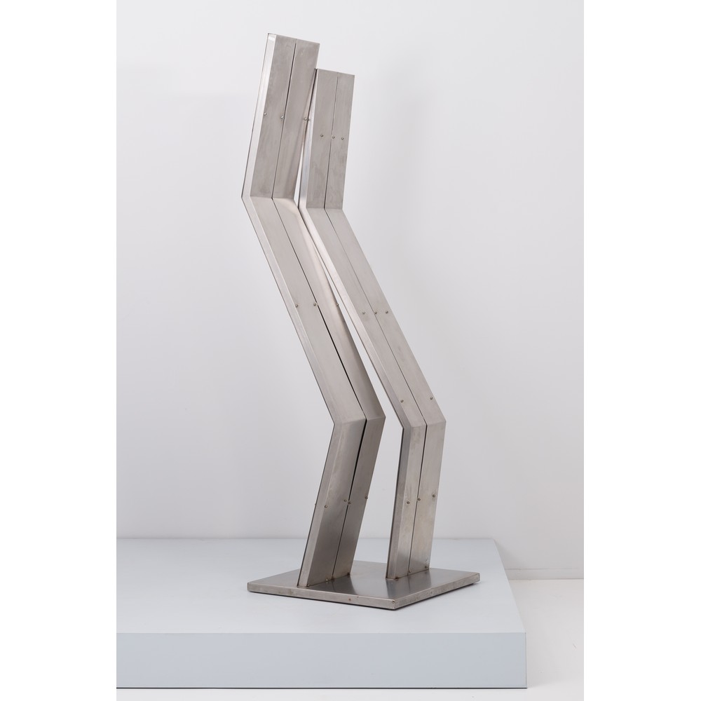 Grande scultura ‘Tensioni’, due volumi piegati in lamina di acciaio, base rettangolare, firmata.