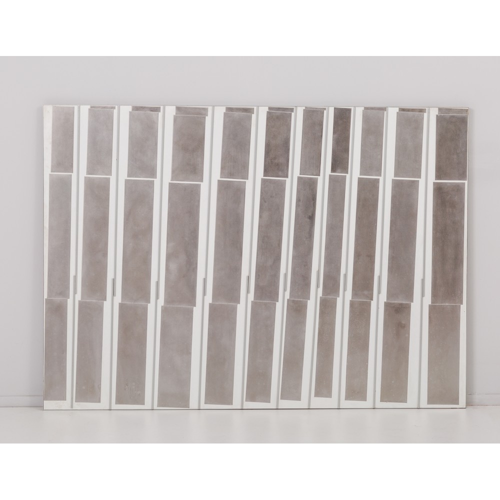 Grande installazione su pannello in legno rivestito in lamina metallica e tondini d'alluminio su sfondo bianco opera sulla rifrazione delle onde sonore. Firma ‘Salvatore’ sul retro. (Probabilmente esposta alla biennale di Venezia, anni '60).