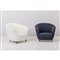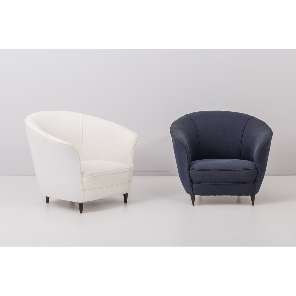 Coppia di poltrone a pozzetto, struttura in legno con imbottitura e rivestimento in tessuto di colore diverso, una bianca e l'altra blu, piedi conici in legno.