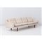 Divano quattro posti, struttura in legno con imbottitura e rivestimento in tessuto di panno color crema, e piedi cilindrici in legno.