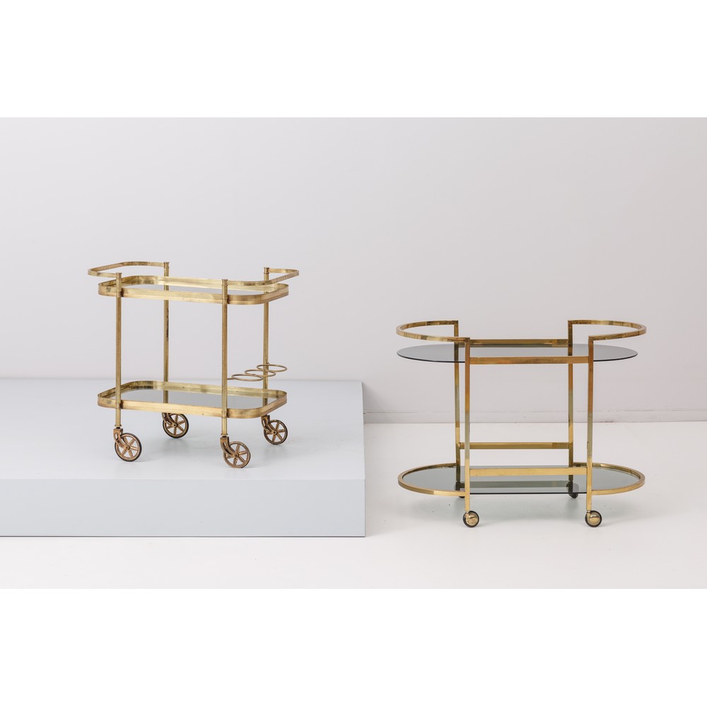 Due carrelli da servizio a due ripiani in ottone spazzolato e vetro fumè.