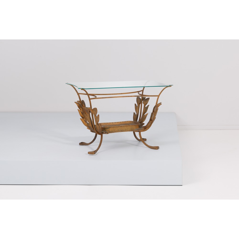 Tavolo da caffè, piano rettangolare con bordi sagomati in vetro, base in metallo con elementi fogliaci.