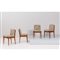 Quattro sedie in legno di teak, seduta e spalliera in tessuto a fiori, etichetta di produzione.