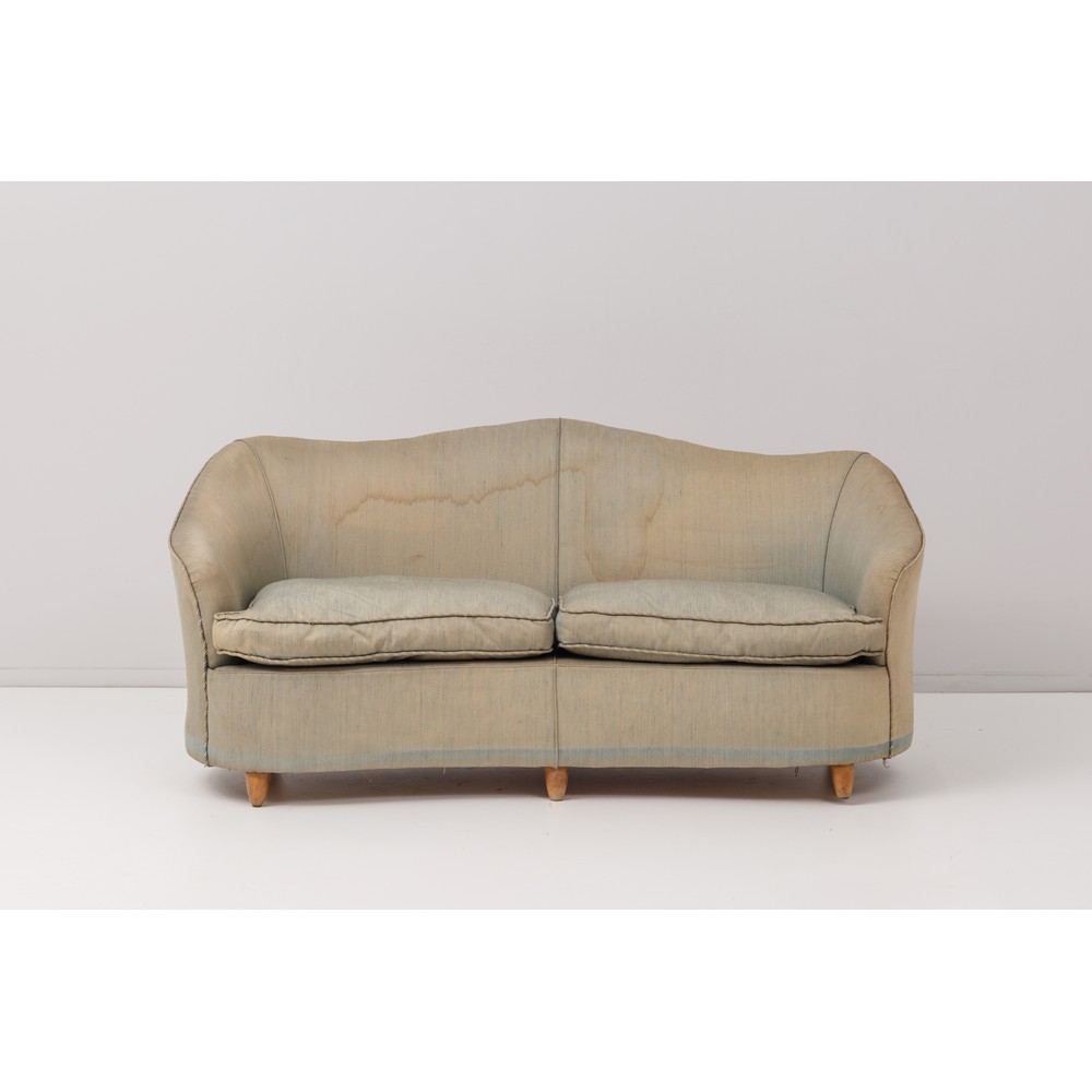 Divano a due posti con struttura in legno con imbottitura e rivestimento in tessuto verde chiaro, piedi conici in legno. Segni di usura.