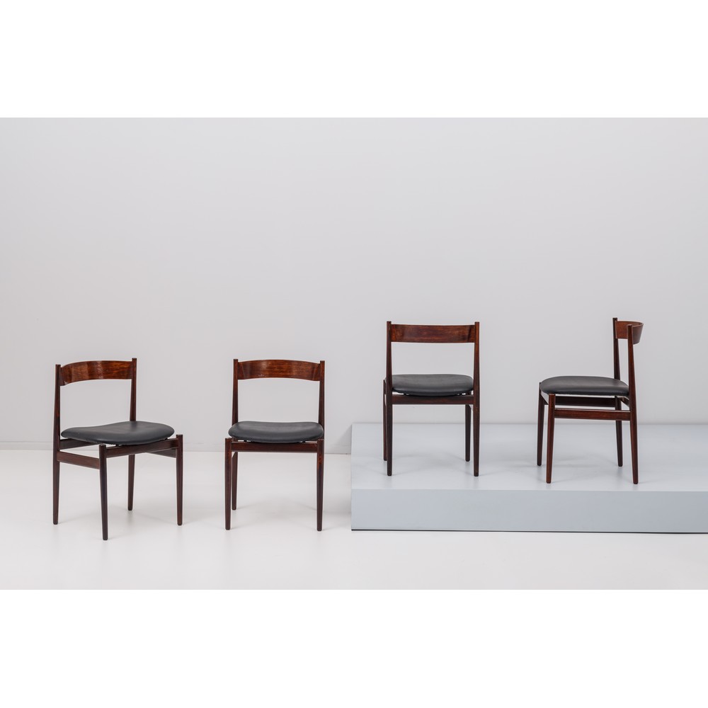 Quattro sedie in legno di palissandro, struttura conica, spalliera curvata, seduta in skai color nero. Etichetta di produzione.