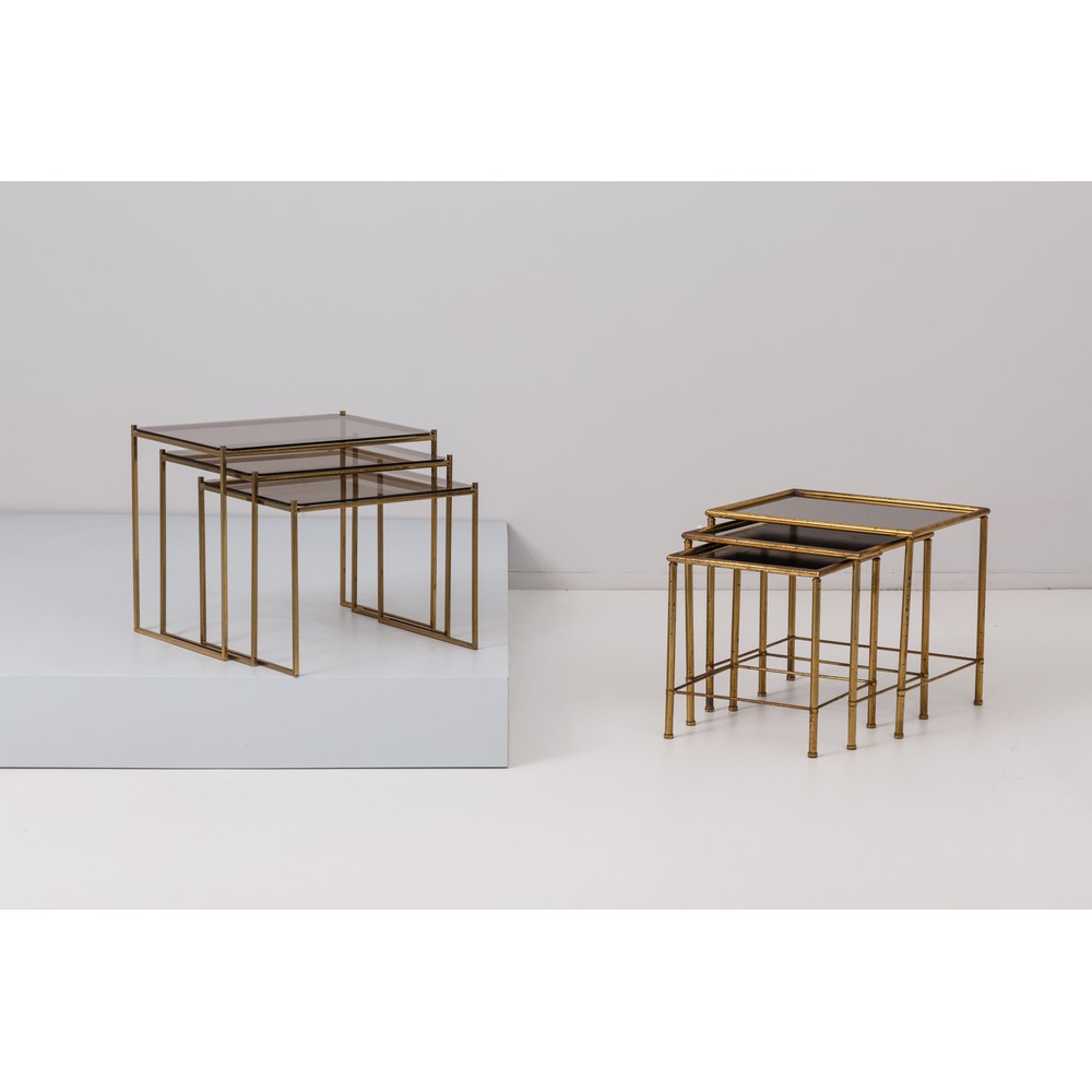 Due lotti composti da tre tavolini d’appoggio a vela, in ottone dorato, piano rettangolare in vetro fumè.