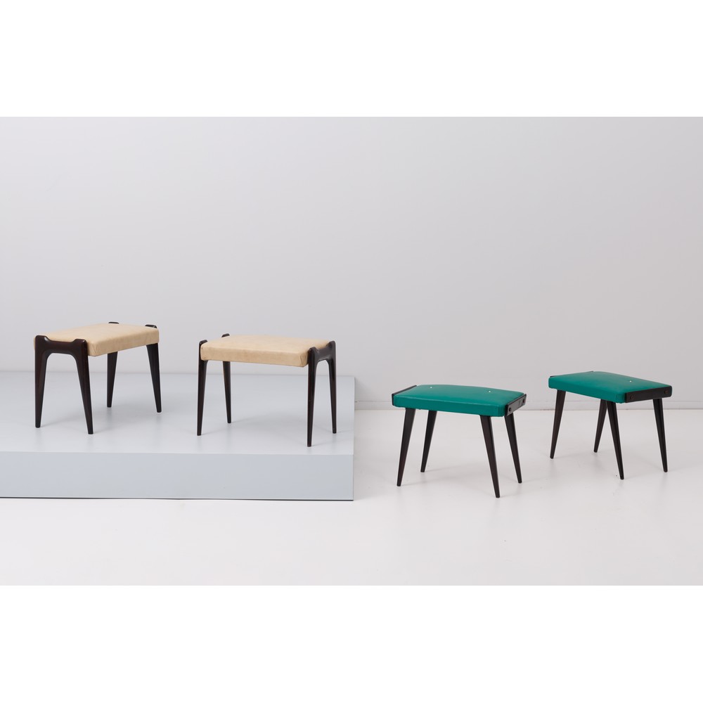 Due coppie di sgabelli in legno ebanizzato, seduta rettangolare rivestita con skai color crema la prima coppia, verde la seconda coppia, piedi a spillo.