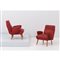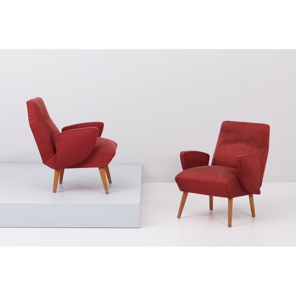 Coppia di poltrone struttura in legno con imbottitura e rivestimento in tessuto di raso rosso, piedi a svasare in legno, segni di usura e macchie.