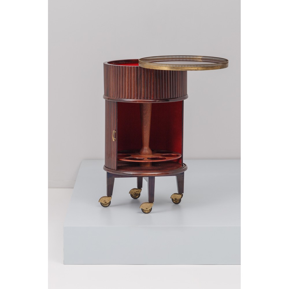 Mobile bar su ruote, corpo cilindrico in legno lavorato con scanalature, sportello a serranda, piano girevole, elementi in ottone.