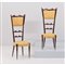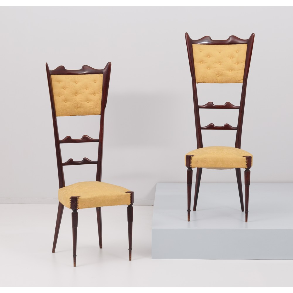 Due sedie a spalliera alta, struttura in legno ebanizzato, rivestimento capitonnè della spalliera e liscio della seduta in tessuto giallo, piedi a spillo.