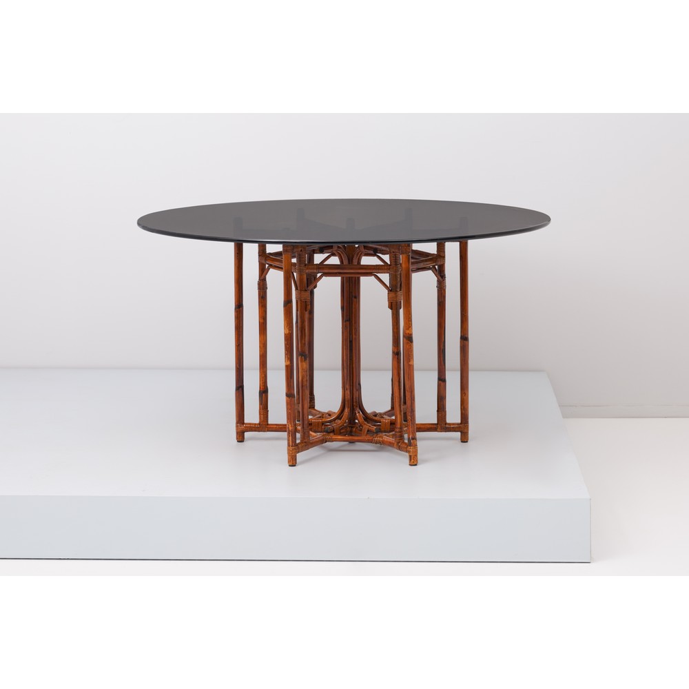Tavolo da pranzo, struttura in tondino di ferro ricoperto da canna e giunco, piano circolare in vetro fumè di forte spessore.
