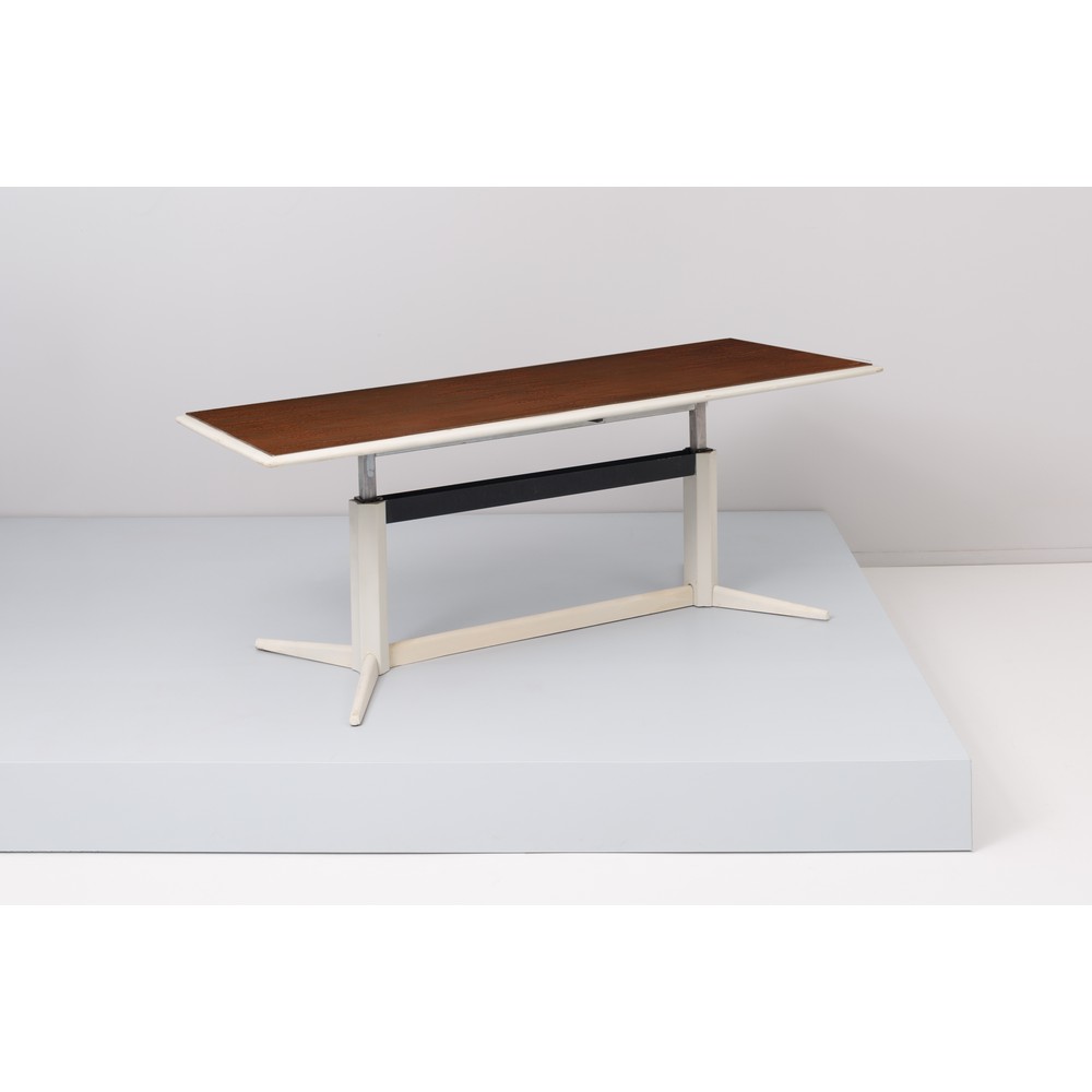 Tavolo in metallo verniciato bianco, sistema meccanico saliscendi, piano rettangolare in laminato.