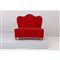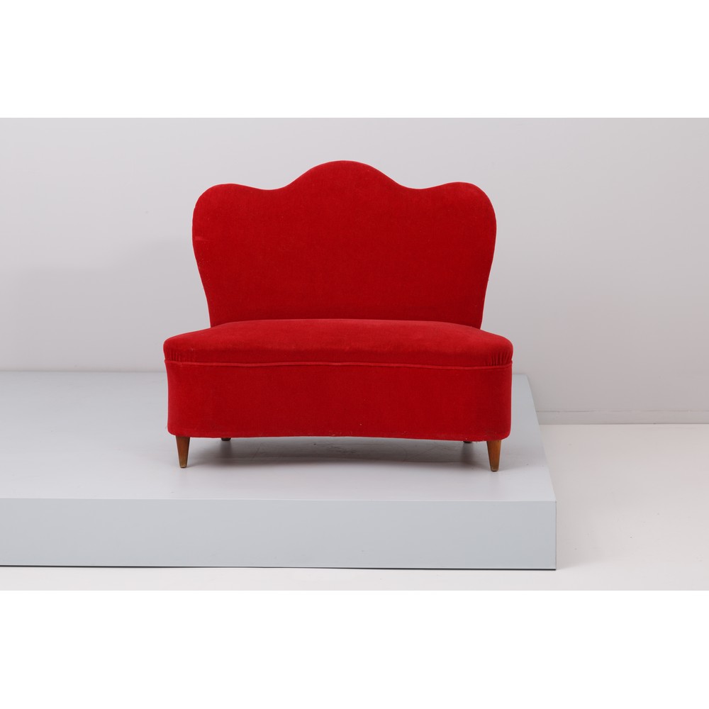 Divano a due posti con spalliera alta e sagomata, struttura in legno con imbottitura e rivestimento in velluto rosso, piedi conici in legno.