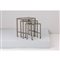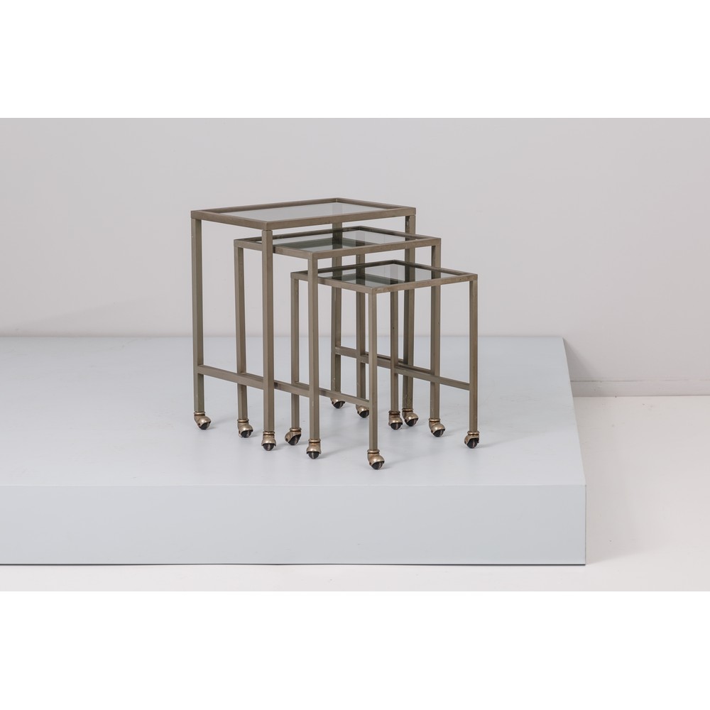 Tre tavoli ad incastro su ruote in metallo, piano rettangolare in vetro fumé.