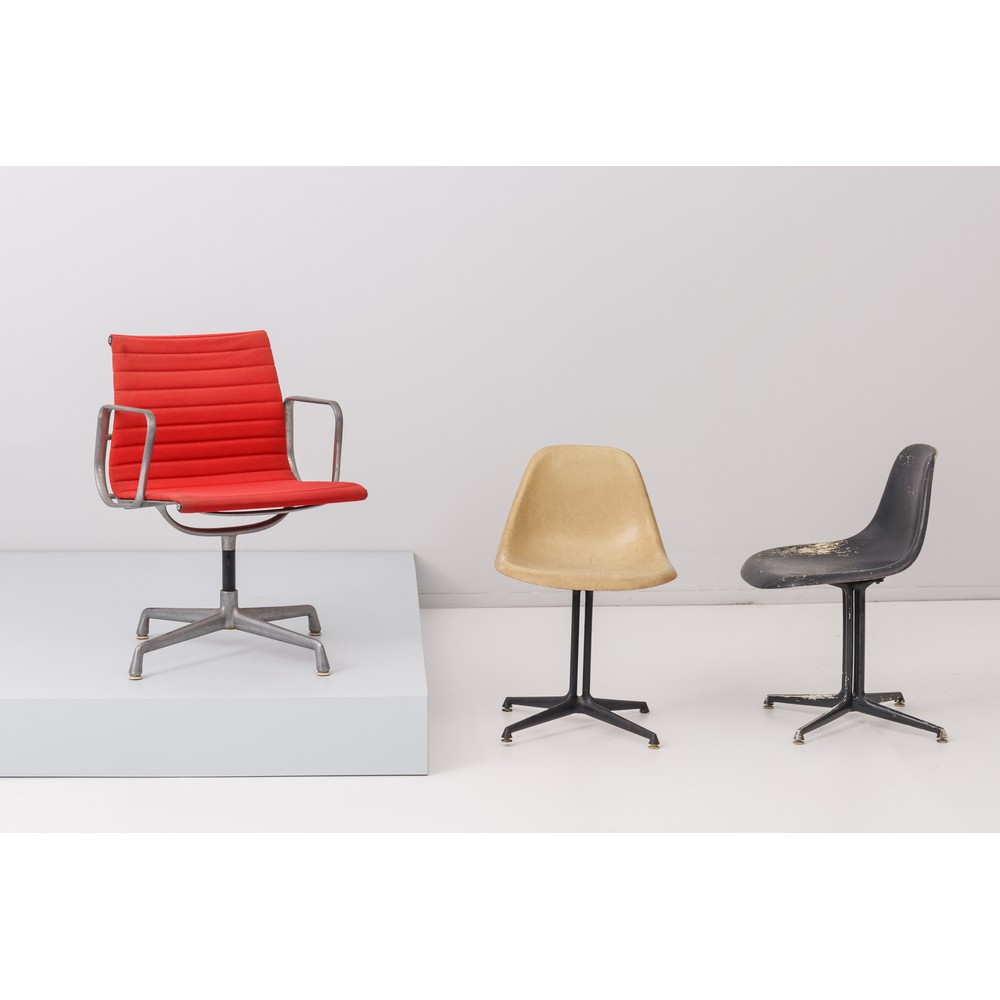 A PAIR CHAIRS MOD. LA FONDA AND AN ARMCHAIR MOD. ALUMINIUM EA103 BY C. EAMES.