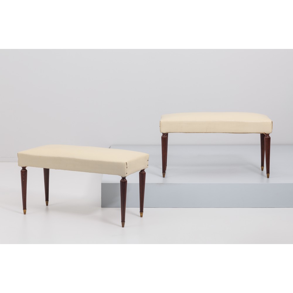 Coppia di panche, struttura in legno, seduta imbottita e rivestita in skai color crema, gambe in legno con scarpette in ottone.